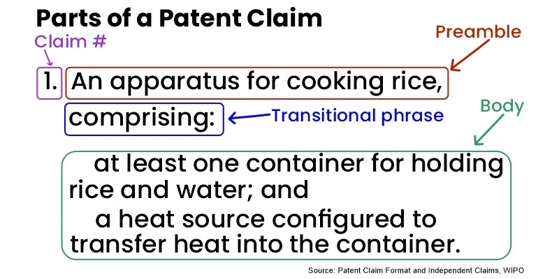 Every claim adheres to a specific format and pattern. A comma separates the preamble from the transitional word, while a colon separates the transitional term from the body. The various components of the invention listed in the claim are divided into separate paragraphs and set off from one another by a semicolon.