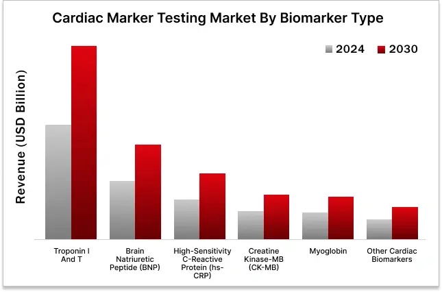 In the cardiac marker testing market, Troponin I and T held the largest share by biomarker type in 2024.