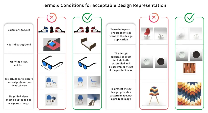 For Filing, EUIPO has set certain terms & conditions for acceptable design representation.