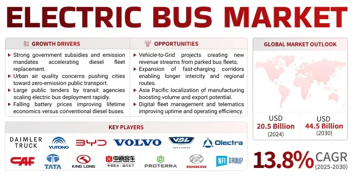 Wissen Research estimates that the global electric bus market reached USD 20.5 billion in 2024 and will grow to USD 44.5 billion by 2030, expected to grow at a CAGR of 13.8% during the 2025–2030 forecast period.